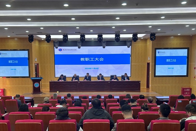 11月4日下午,我校在实训楼五楼报告厅召开全体教职工大会,总结回顾上半学期工作,安排部署近期重点工作。学校领导班子成员出席并在主席台就坐,全体教职工参加会议。党委副书记、副校长张中华主持会议。
