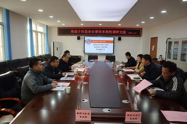 11月13日下午,新疆于田县人社局局长、于田县高级技工学校党委书记何贵军,陕西天益教育科技有限公司副总经理魏旬一行4人来我校调研交流。我校党委书记顾学福、校长魏萍、副校长李孝勇、校长助理胡振彪和相关科室负责人出席交流会。