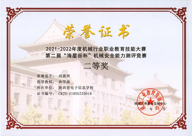 2021-2022年度机械行业职业教育技能大赛――机械安全能力测评竞赛落下帷幕,我校机电20253班陈鼎浩和数控19151班尚嘉琪在张建永、孙学涛老师的指导下均获得数控车床加工操作安全能力测评赛项中职组二等奖。
