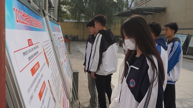 图为我校学生观看“爱惜粮食 光盘行动”相关宣传展板