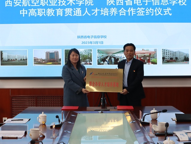 我校校长魏萍与西安航空职业技术学院副校长侯晓方签订中高职教育贯通人才培养合作协议,副校长李孝勇代表我校接受西安航空职业技术学院授牌。双方参会人员还围绕推动中高职衔接进行深入交流,并洽谈了相关具体事宜。