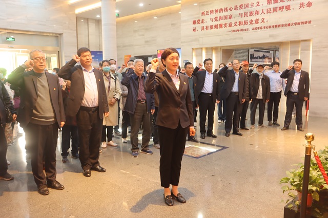 赏心悦目的踏青活动结束之后,我校党委委员和离退休老同志们来到西安交通大学西迁博物馆,参观溯源、西迁、致远展厅,聆听生动讲解,切身感受西迁人胸怀祖国、艰苦奋斗和践行初心的光辉历程。