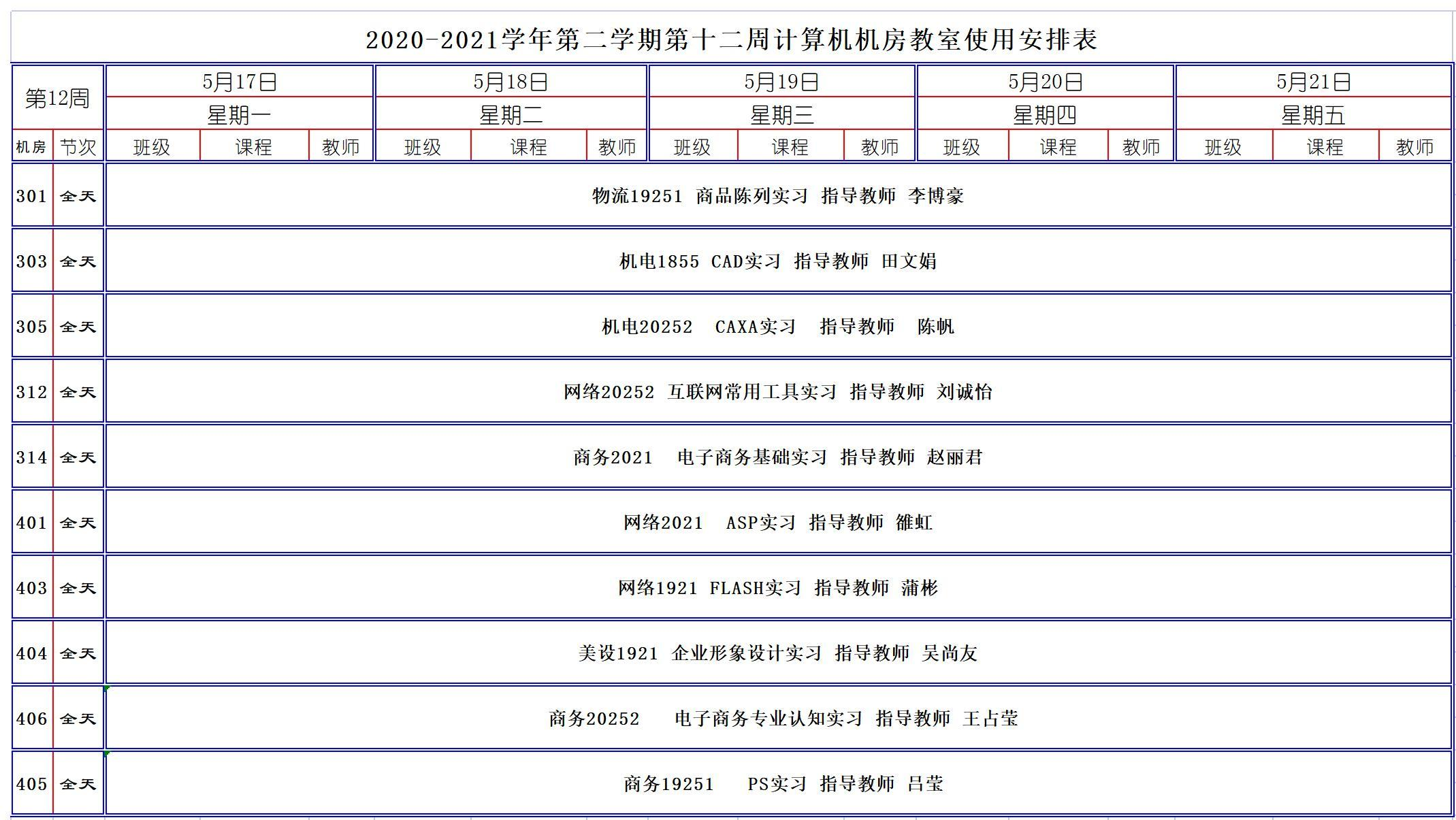 2020-2021学年第二学期第12周计算机机房教室使用安排表