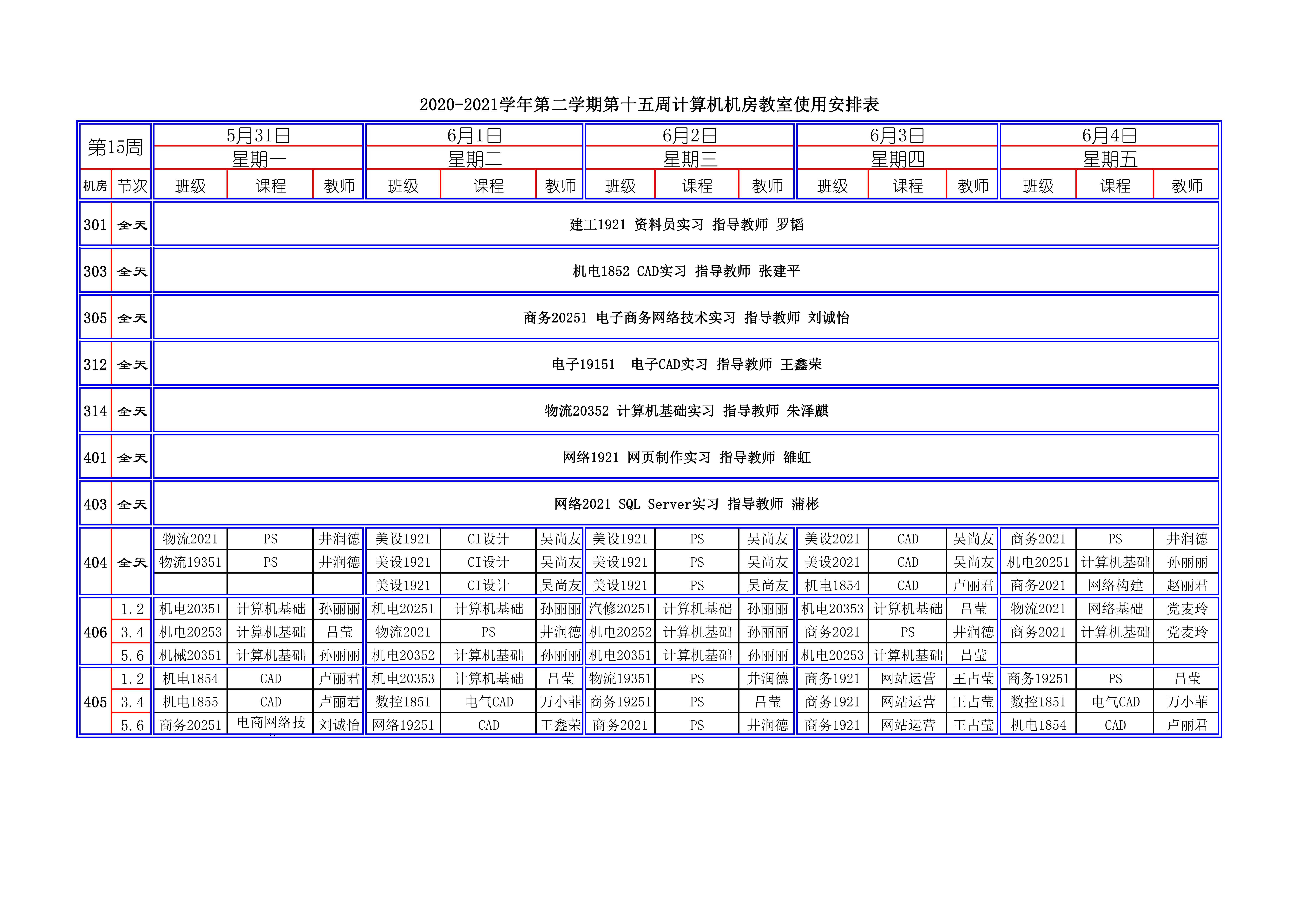 2020-2021学年第二学期第15周计算机机房教室使用安排表