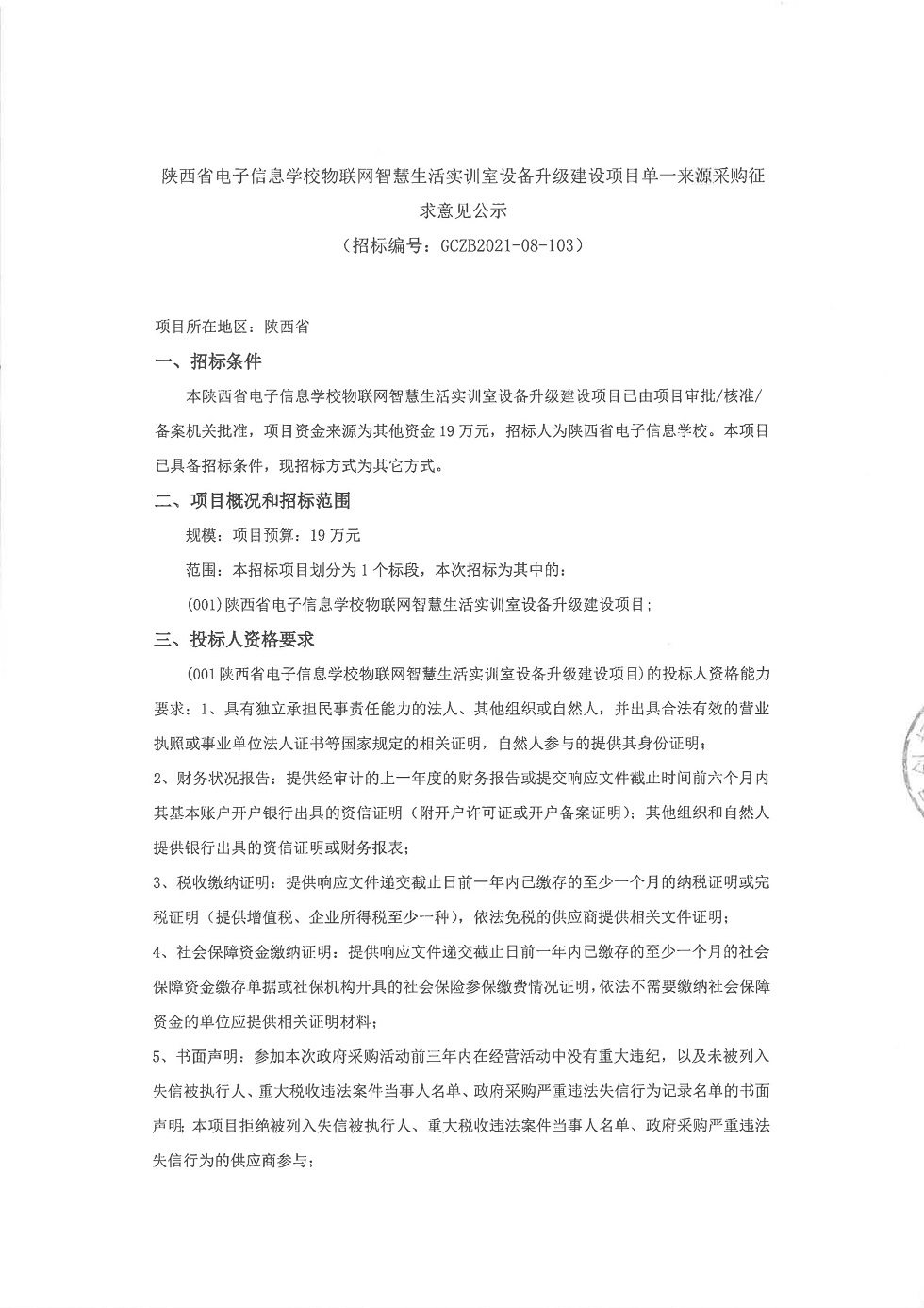 陕西省电子信息学校物联网智慧生活实训室设备升级建设项目单一来源采购征求意见公示