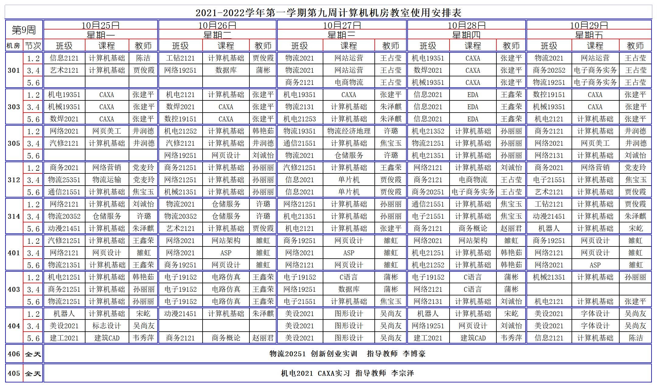2021-2022学年第一学期第9周计算机机房教室使用安排表
