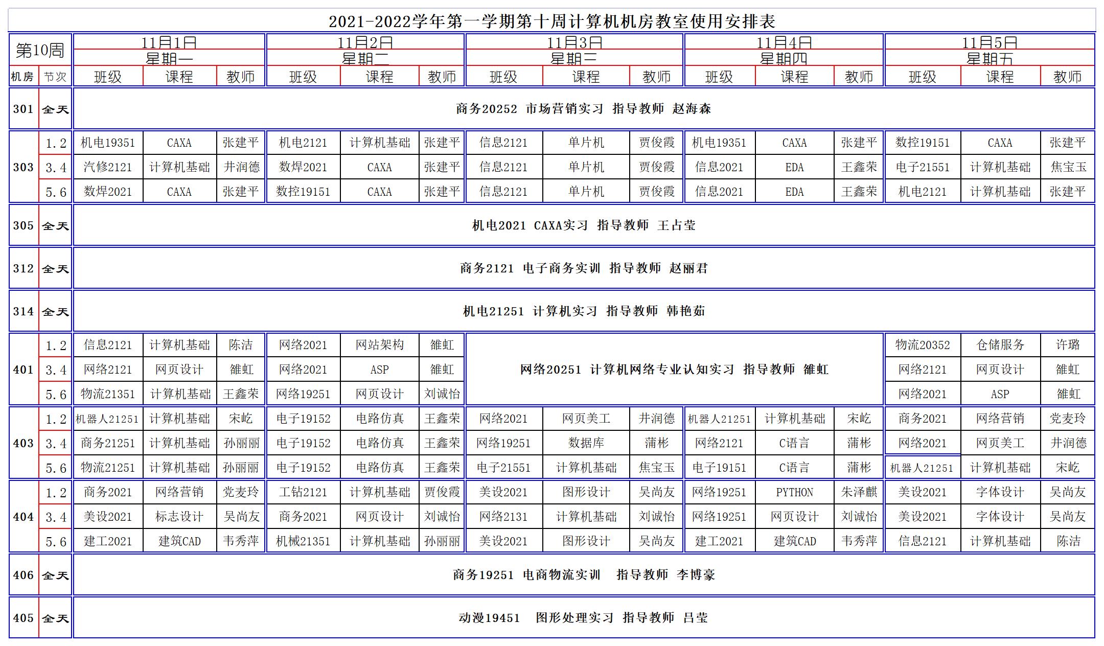 2021-2022学年第一学期第10周计算机机房教室使用安排表
