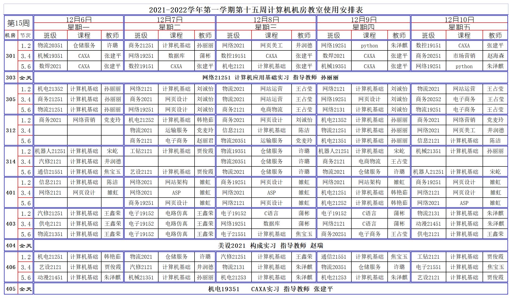 2021-2022学年第一学期第15周计算机机房教室使用安排表
