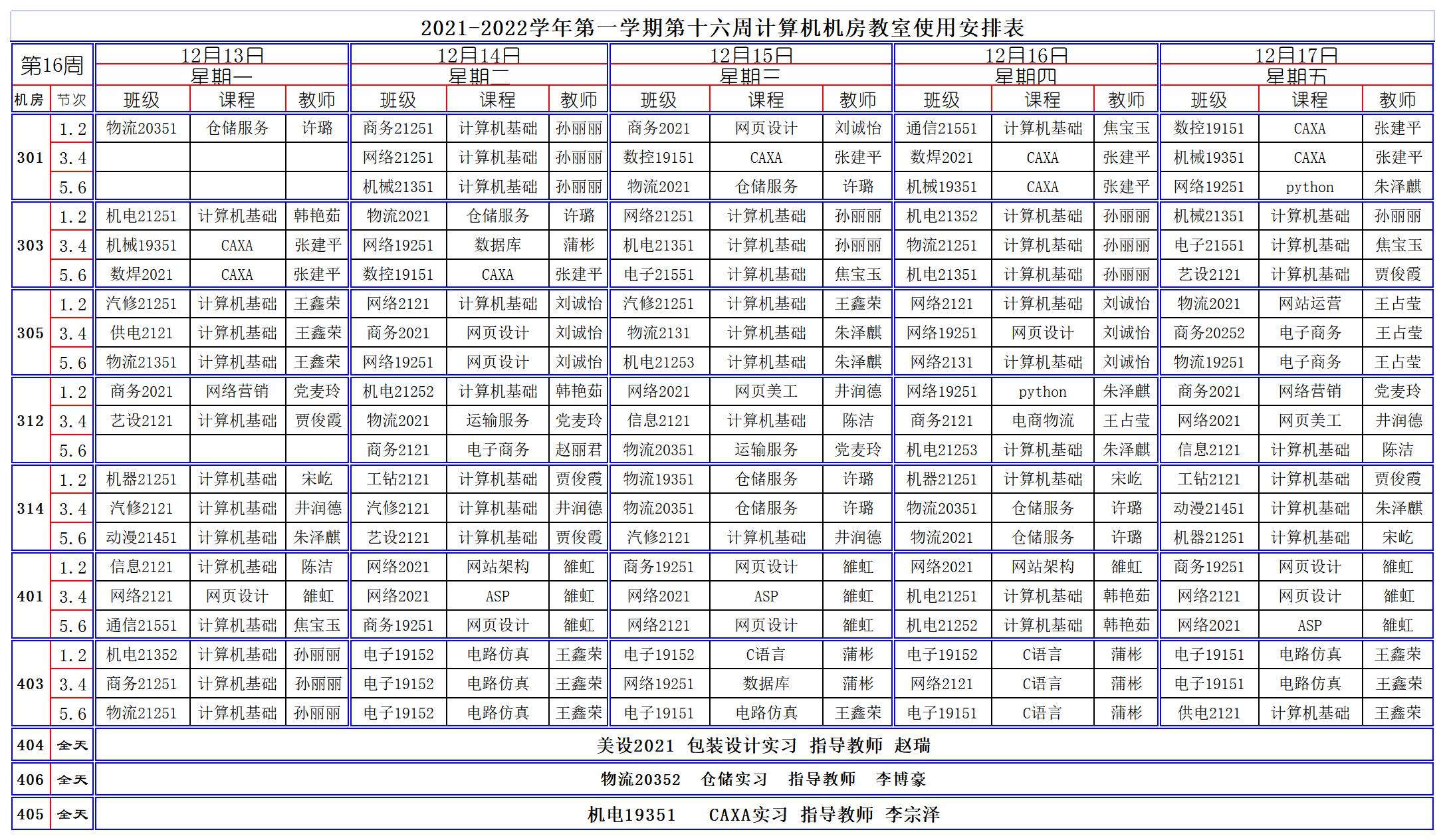 2021-2022学年第一学期第16周计算机机房教室使用安排表