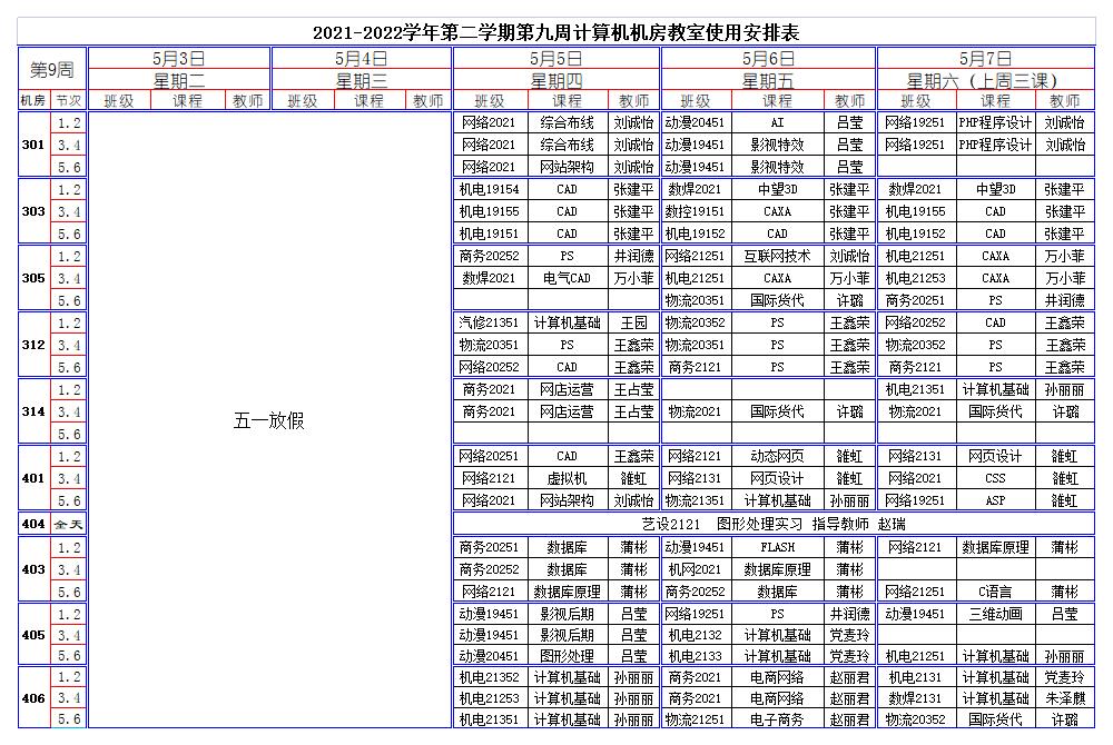 2021-2022学年第二学期第9周计算机机房教室使用安排表