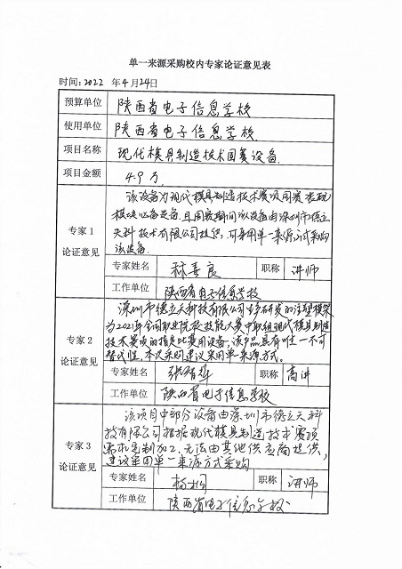 该项目采购设备用于全国职业院校技能大赛(中职组)现代模具制造技术-注塑模具技术赛项模具装配模块,而该模块所使用的钳工台和模架是由合作企业“深圳市德立天科技有限公司”提供的,具有唯一性,故经论证本次采购的系统符合单一来源的相关条件,建议采用单一来源方式采购,由深圳市德立天科技有限公司为本项目唯一供应商。
