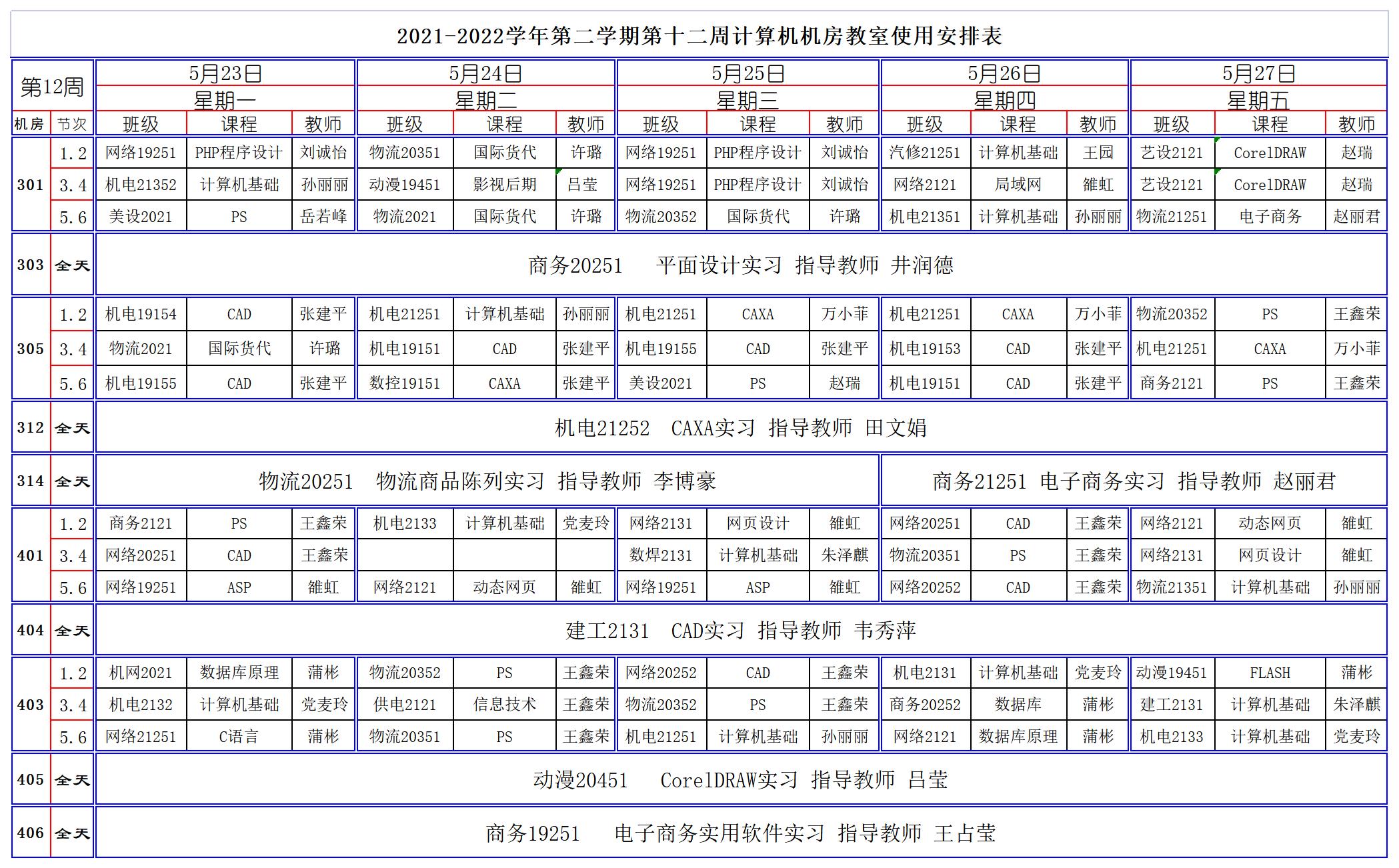 2021-2022学年第二学期第12周计算机机房教室使用安排表
