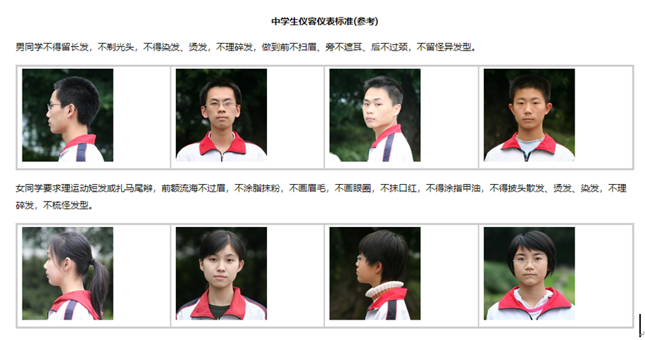 2.男生不留长发、不剃光头、不染发、不烫发,做到前不扫眉,侧不过耳,后不过颈;不佩戴项链、耳钉、耳环、戒指等饰品。