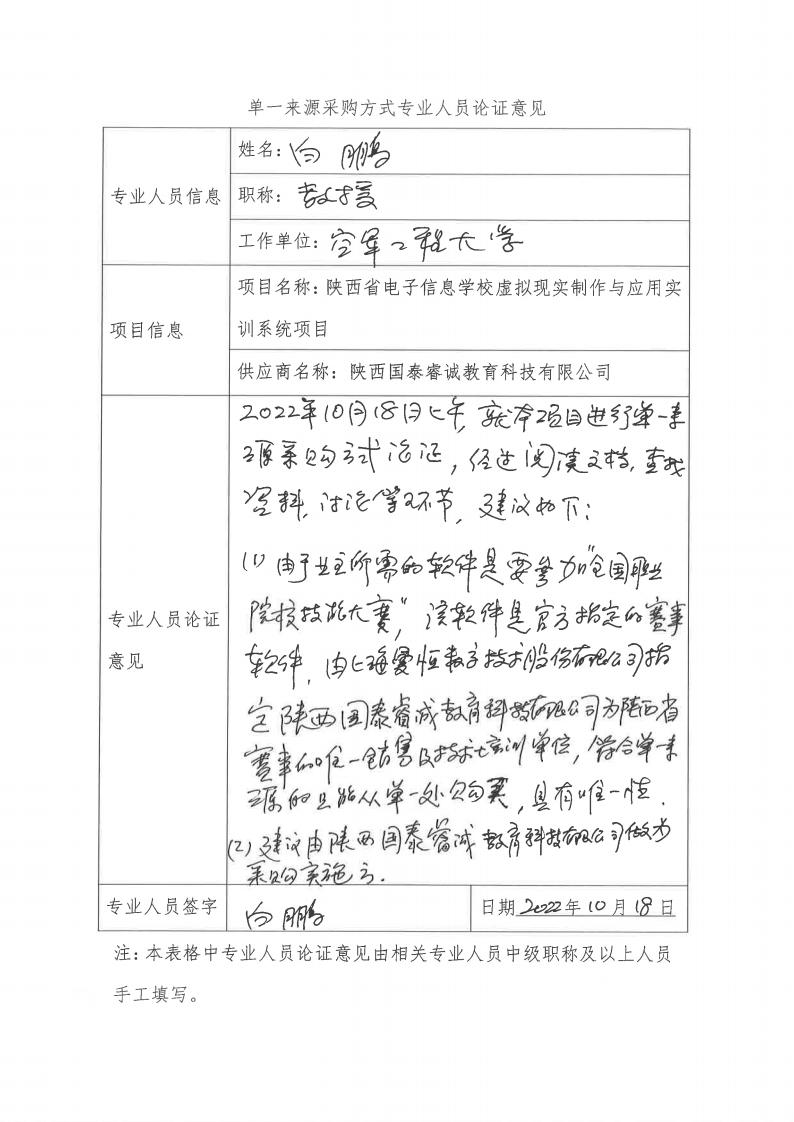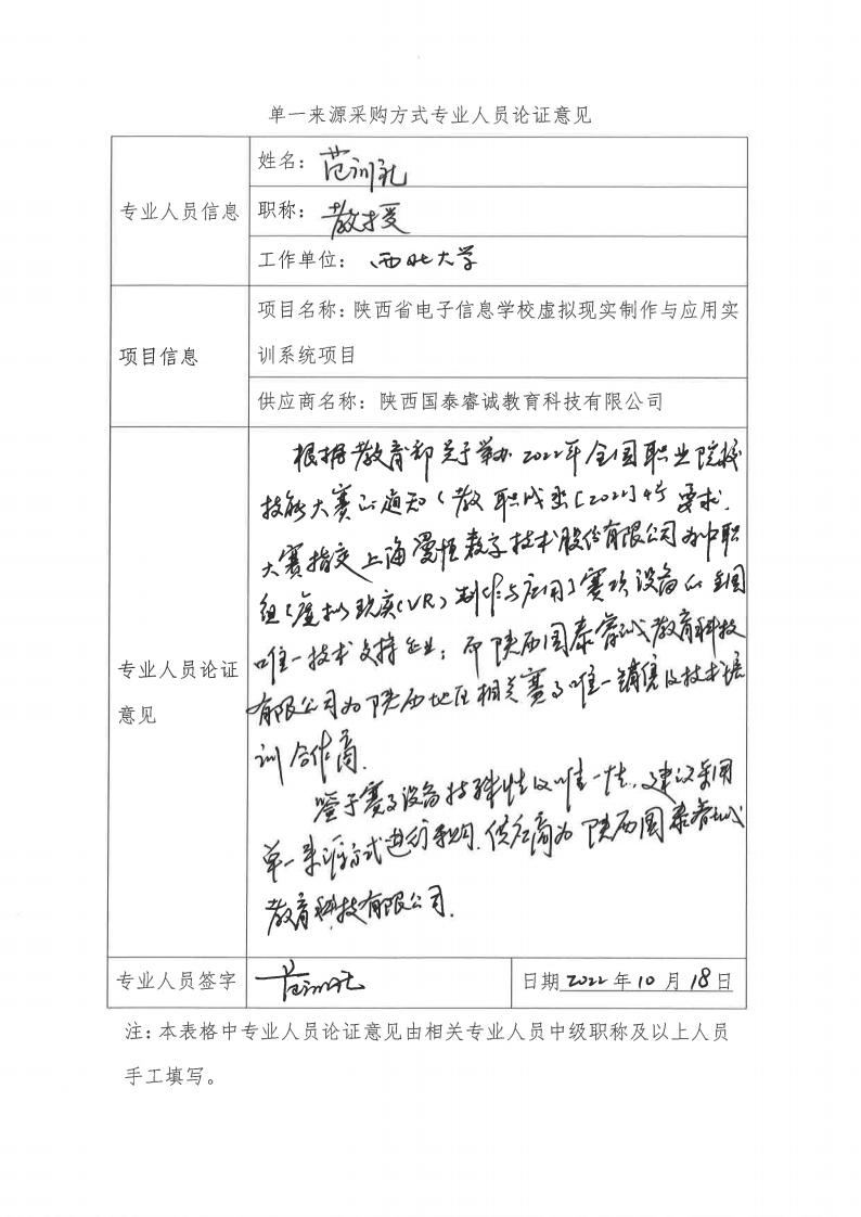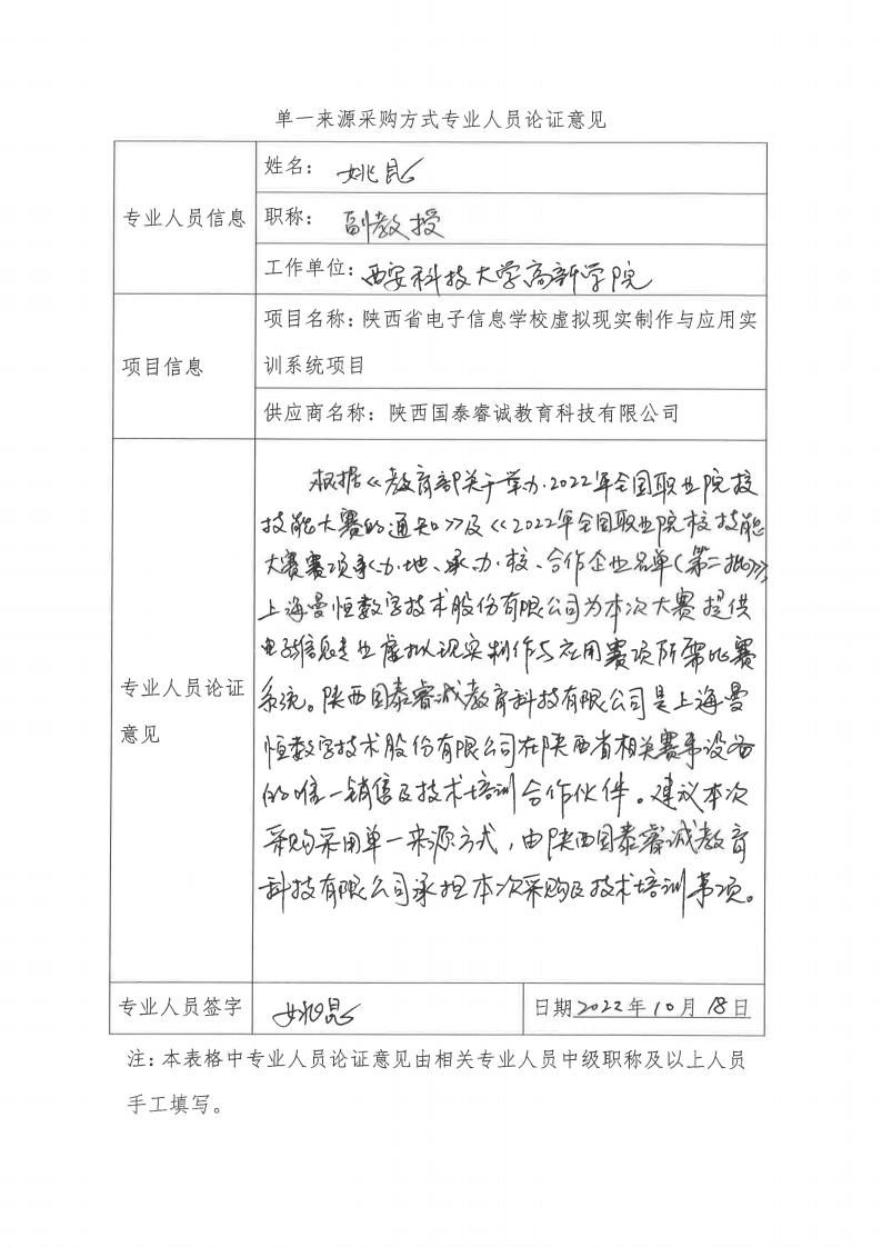 采用单一来源采购方式的原因及说明:根据《教育部关于举办2022年全国职业院校技能大赛的通知》及《2022年全国职业院校技能大赛赛项承办地、承办校、合作企业名单(第二批)》,上海曼恒数字技术股份有限公司为本次大赛提供虚拟现实(VR)制作与应用赛项所需比赛系统,陕西国泰睿诚教育科技有限公司是上海曼恒数字技术股份有限公司在陕西省相关赛事设备的唯一销售及技术培训合作伙伴。鉴于赛事设备特殊性及唯一性,建议本次采购采用单一来源方式,供应商为陕西国泰睿诚教育科技有限公司。