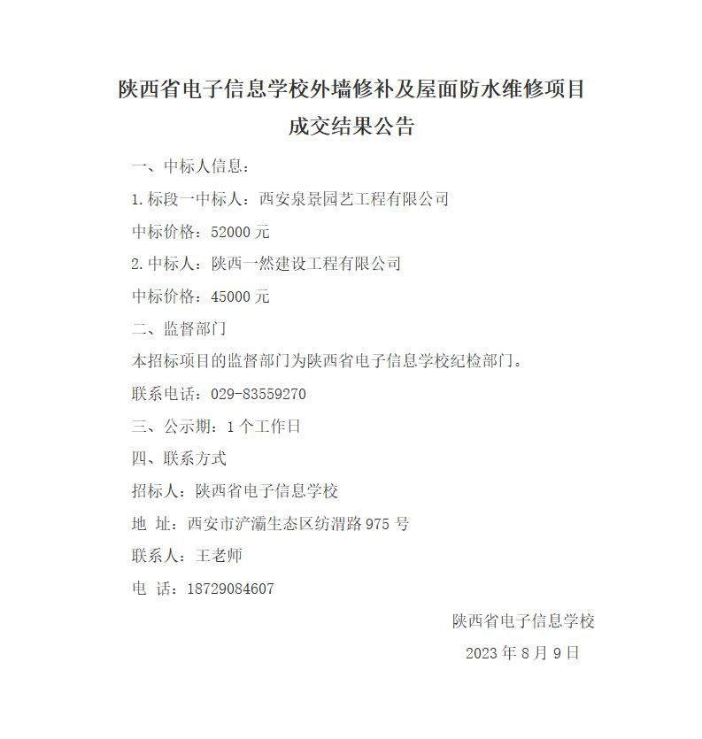陕西省电子信息学校外墙修补及屋面防水维修项目中标公告