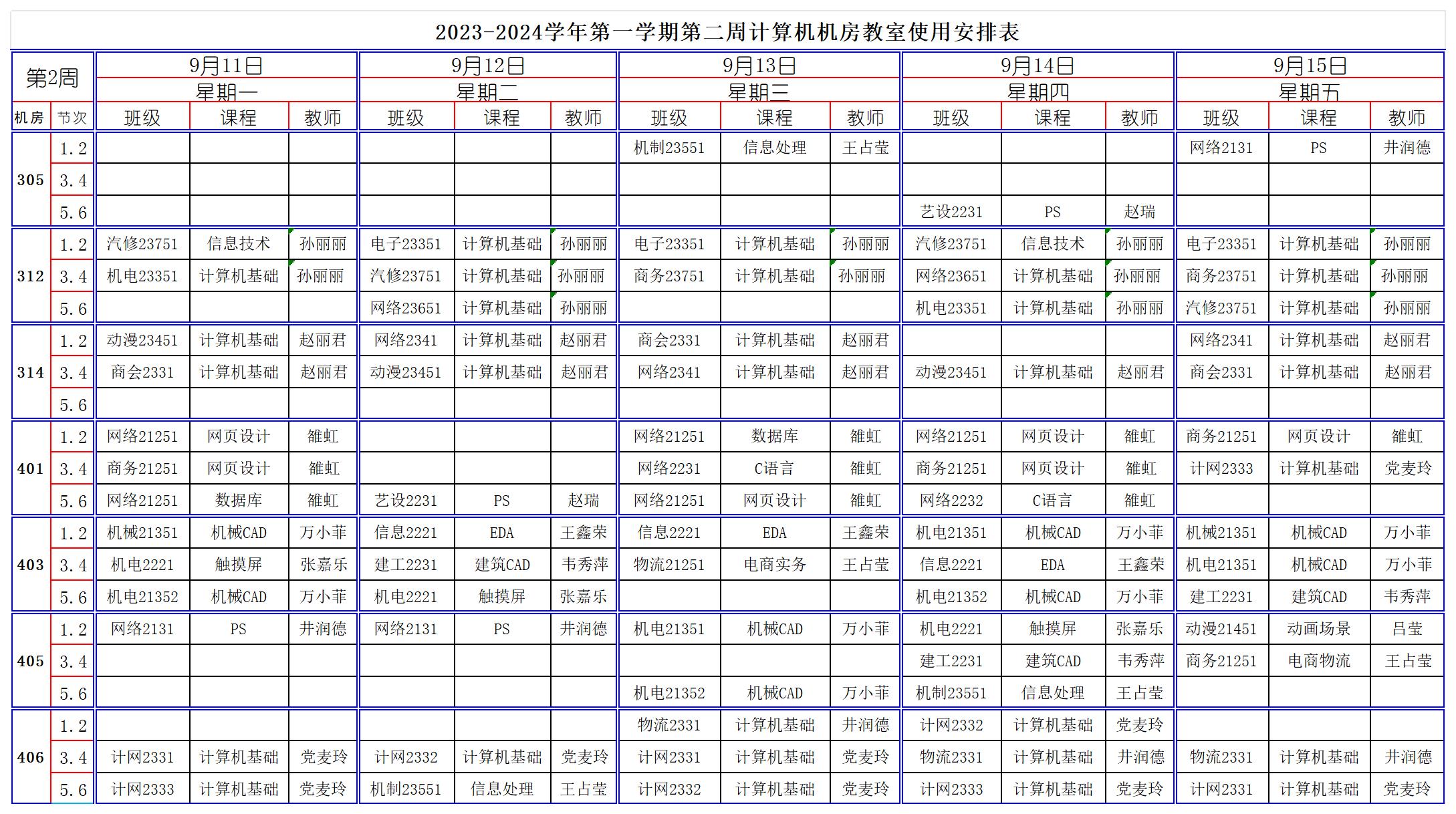 2023-2024学年第一学期第二周计算机机房教室使用安排表