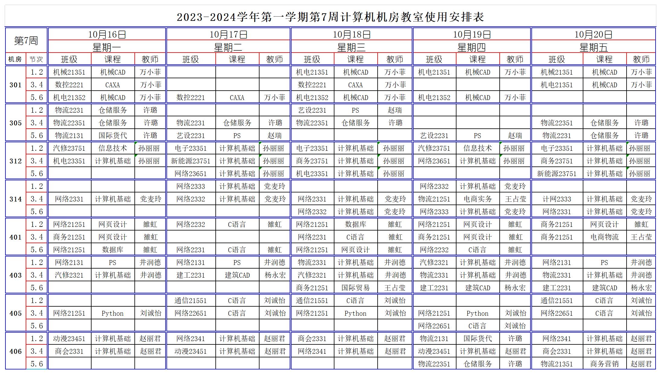 陕西电子信息学校2023-2024第一学期第7周机房排课表