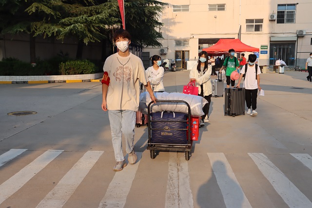 ——热情服务,精心保障。开学日,全体教职工和志愿者7:00准时到岗,严格履行岗位职责,扎实做好本职工作。学生们经过扫码、测温等疫情防控流程,与家长挥手道别。穿梭在校园里的“红马甲”和教职工,热心帮助学生搬运行李、完成报到手续、领取公寓物品、进入学生公寓,整个过程忙而不乱,紧张有序。学生报到当日,即进行一次核酸检测,随后将按照开学疫情防控要求,严格落实2、3、5、7全员核酸检测,确保“不落一人、应检尽检”。学生们严格执行学校的静态管理政策,不堂食、不军训、不聚集、不举办大型会议、论坛等聚集性活动。