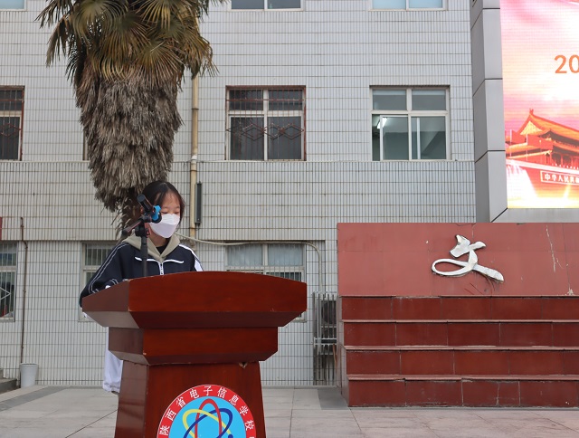 升旗完毕,商务21251班蔺娇娇发表国旗下讲话,她用铿锵有力的声音代表全体学生表态,新学期要坚定理想信念,规范自身言行,做文明的新时代好青年;要快速、稳步进入学习状态,确立新目标,制定新规划,通过不懈努力实现美好梦想。
